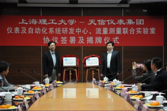 2014年11月25日下午,由上海理工大學與天信儀表集團有限公司合作建立的“上海理工大學—天信儀表集團儀表自動化系統研發中心、流量測量聯合實驗室”正式掛牌使用。上海市教委科技發展中心主任許開宇等教委領導、上海理工大學副校長鄭剛等校方領導、蒼南縣副縣長林朝朝等政府領導、天信儀表集團總裁范叔沙等企業代表出席揭牌儀式,并由上理工光電學院院長莊松林院士和天信儀表集團常務副總裁兼總工葉朋揭牌。