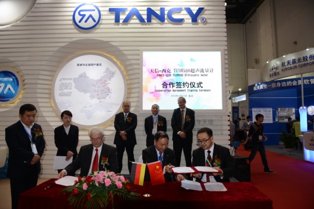 本次北京參展還有一項重要議程,西克天信USM500超聲波流量計合作協議簽約儀式于10:00正式開始,參加簽約儀式的有來自北京西克麥哈克公司和德國西克的領導以及天信公司董事長,總裁,技術總監,參展商代表等。營銷中心總監范曄主持簽約儀式,陳開云董事長致歡迎辭,西克銷售經理班吉爾先生代表西克公司發表致辭。本儀式簡約而隆重,許多載入天信展會上的許多參展商也應聲來到天信展臺,為之喝彩。本次合作,有利于發揮各自優勢,深化互利合作,共同推進超聲波流量計產品及技術領域的長足發展。